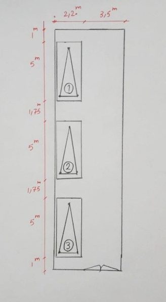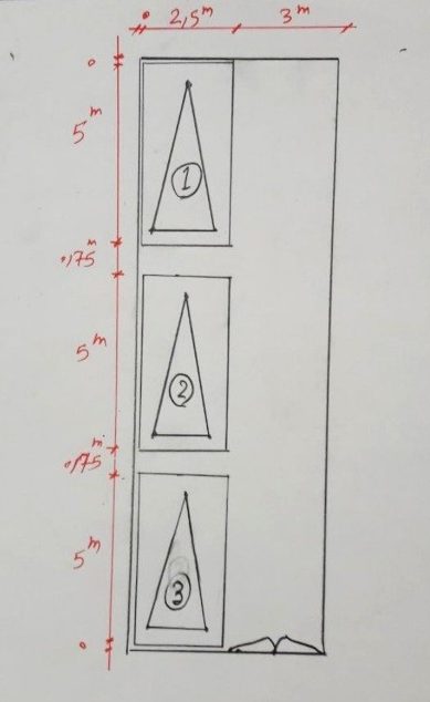 - مطابق تصویر شماره 1 طبق ضوابط شهرداری وقتی سه پارکینگ پست سر هم قرار میگیرند فاصله بین ماشین ها باید حداقل 75 سانتیمتر باشد و عرض راهرو باید حداقل 3متر باشد. همچنین ابعاد پارکینگها مطابق ضوابط شهرداری یک مستطیل به ابعاد 2.5*5 متر میباشد و بین دیوار و خودرو نیازی به وجود فضای اضافی نیست. اما در ضوابط اداره ثبت وضع متفاوت است مطابق تصویر شماره2، اداره ثبت، ابعاد مستطیل پارکینگ را 2.2*5 متر در نظر میگیرد.فاصله دیوار جلویی با ماشین را حداقل 1متر و فاصله بین دو خودرو را 1.75متر و عرض راهرو عبوری برای ماشین را 3.5 متر در نظر میگیرد.