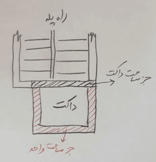 - حال میخواهیم بدانیم که داکت ها و کانال های کولر و رایزر ها و لوله بخاری ها در مشاعات و مفروزات و در صورت مجلس تفکیکی توسط کارشناس تفکیک در کجاها ذکر می شوند. لازم است بدانید که داکتها و رایزر ها، جزء مشاعات بوده، اما دیوارهای پیرامونی آنها جزء واحد محسوب می شوند. درشکل ذیل همانطور که مشاهده می فرمائید دیوار مشترک بین داکت و راه پله که به رنگ آبی نشان داده شده است جزء مساحت داکت محسوب می شود و دیوار اطراف داکت که به رنگ قرمز نشان داده شده است جزء مساحت واحد می باشد.