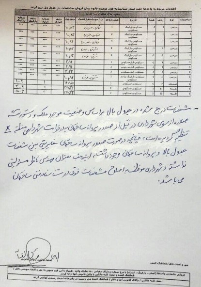 این فرم ها در این مرحله (قبل از صدور پروانه ساختمان) نباید امضاء شوند. در صورتیکه با فشار شهرداری این فرم ها را قبل از صدور پروانه ساختمانی امضاء کردید در تمامی فرم ها حتماً این جمله را قید کنید(تصویر 2) :